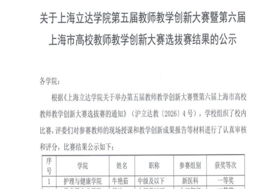 牛艳茹、李炫桦、尹欢欢组成的外科护理学教学团队,凭借扎实的教学功底、创新的教学设计,参加上海立达学院第五届教师教学创新大赛暨第六届上海市高校教师教学创新大赛选拔赛新医科赛道比拼,斩获校级选拔赛一等奖。团队以《外科护理学》核心课程为依托,紧扣新医科建设要求,融合“岗课赛证思”教学体系,将临床护理岗位需求、技能大赛标准与课程思政深度结合,其打造的 “理论精讲+仿真实训+临床能力前置培育”三位一体教学模式,以及线上线下混合式教学的实践成果,获得评委高度认可。